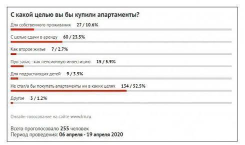 В сегменте апартаментов доля инвестиционного спроса выше, чем в новостройках с официальным жилым статусом. «В отдельных проектах апартаментов инвестиционный спрос составляет до 50-60%, в то время как в большинстве квартирных проектов не превышает 15%», - говорит Василий Фетисов. По данным онлайн-голосования на IRN.RU, для собственного проживания апартаменты купили бы всего 10,6% ответивших, в то время как 23,5% приобрели бы апартаменты для сдачи в аренду.