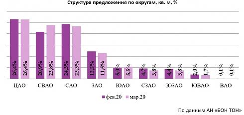 Основное предложение, более 70%, сосредоточено в 3 столичных округах. Лидируют ЦАО с 26,4%, СВАО с 23,8% и САО с 23,3%. За месяц Северо-Восточный округ Москвы показал наибольший прирост, так как вышли новые объемы апартаментов в продажу. Доля увеличилась с 20,9% до 23,8%, а экспозиция на 16,3%. Во всех остальных локациях за месяц наблюдалось сокращение экспозиции на 2,2 -17%.
