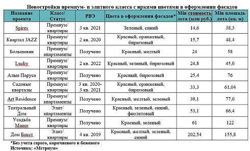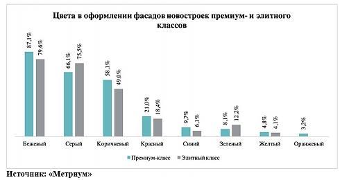 У 72,6% новостроек премиум-класса серый, бежевый и коричневый являются основными цветами, другие в палитре не представлены. В элитном сегменте колористическое разнообразие незначительно выше – только этими тремя цветами ограничиваются 69,4%.