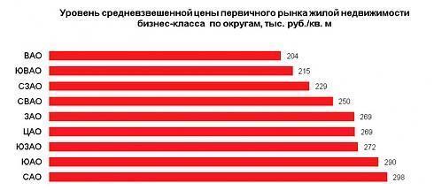 Минимальный уровень цен относится к ВАО – 204 тыс. руб./кв. м, а также ЮВАО, в котором средняя стоимость находится на уровне 215 тыс. руб./кв. м. Самым дорогим традиционно остается САО с показателем 298 тыс. руб./кв. м, в данной локации ряд проектов по своим качественным характеристикам приближены к премиум-классу, а значительный объем в них находится на высокой стадии строительства.