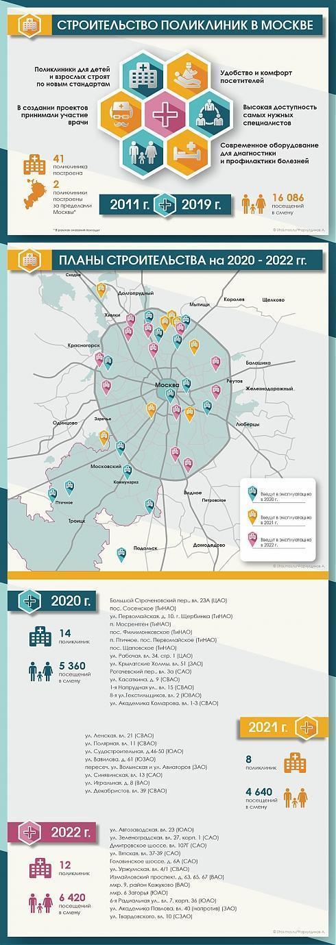 «В бюджете города заложены средства на строительство 27 поликлиник, 14 больничных корпусов и шести подстанций скорой медицинской помощи в период с 2020 до конца 2023 года», – пояснил Бочкарев.