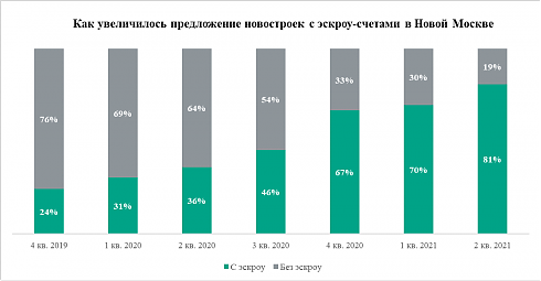 Из-за резкого роста нового предложения на местном рынке закономерно увеличилось число квартир, которые продаются застройщиками по новым правилам, то есть через посредничество банка. По подсчетам аналитиков «Метриум», порядка 8,7 тыс. квартир можно приобрести, внеся средства на эскроу-счета в банке, который выделяет средства на их строительство. Это 81% от общего объема предложения. Только за 2 тыс. лотов (19%) в новомосковских новостройках застройщики планируют получить средства напрямую от дольщика. Для сравнения: в «старой» Москве доля экспозиции квартир массового сегмента, продающихся по новой схеме, составляет только 72%.