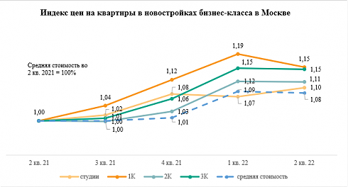 Во II квартале 2022 года средняя стоимость квартиры в новостройках бизнес-класса в Москве достигла 29,1 млн рублей, что на 8% больше, чем в аналогичный период 2021 года. Однако динамика роста цен была неоднородной у разных типов квартир. Быстрее всего дорожали однокомнатные квартиры.