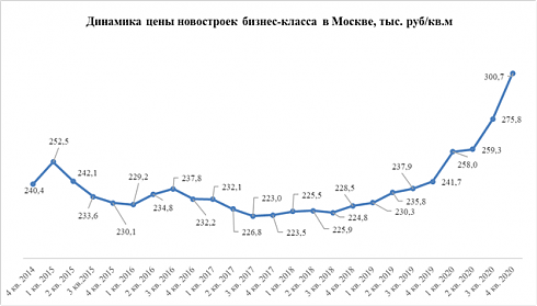 По подсчетам аналитиков «Метриум», в IV квартале 2020 года средняя стоимость квадратного метра в новостройках бизнес-класса в Москве составила 300,7 тыс. рублей. Это на 9% больше, чем в III квартале (275,8 тыс. рублей). За 12 месяцев показатель увеличился на 24% – год назад новая квартира бизнес-класса обходилась в среднем в 241,7 тыс. рублей за кв.м.