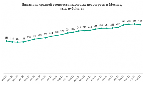 Средняя стоимость квадратного метра в массовых новостройках Москвы в мае сократилась до 282 тыс. рублей, что на 1,4% меньше, чем в апреле, подсчитали аналитики «Метриум». Средняя стоимость квартиры также уменьшилась почти на 1%. Это первое столь значительное снижение цены почти за два года – в последний раз цена квадратного метра в ЖК эконом- и комфорт-класса корректировалась в мае-июне 2020 года.