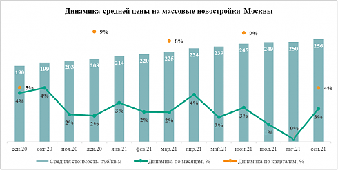 В сентябре средняя цена квадратного метра на рынке массовых новостроек Москвы достигла 256 тыс. рублей, что на 4,5% больше, чем в июне, в последний месяц субсидирования ипотеки в Москве, подсчитали эксперты «Метриум». Замедление роста цен было отмечено только в июле и августе. При этом за III квартал количество заключенных договоров долевого участия в Москве упало на 14,8% относительно прошлого квартала.
