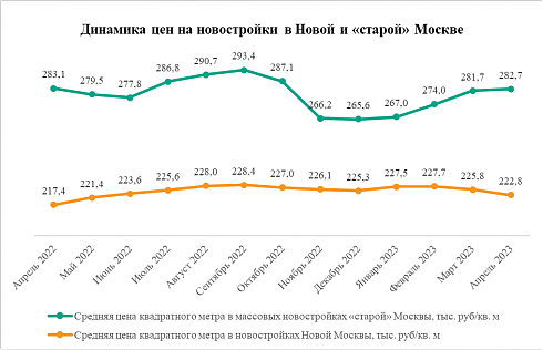 В «старой» Москве картина иная – здесь цены достигли максимума только в сентябре 2023 года (293,4 тыс. рублей за кв. м), после чего сократились до 266,2 тыс. рублей в ноябре, но в 2023 году возобновили рост и повысились к апрелю до 282,7 рублей, что сопоставимо с апрелем 2022 года.