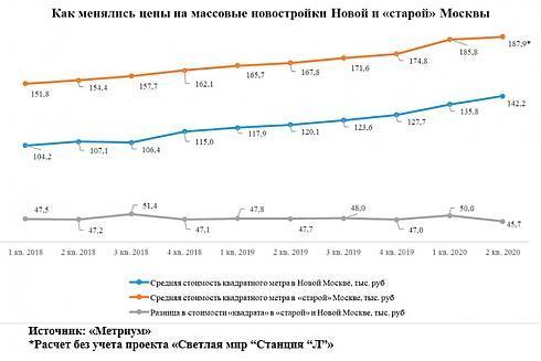 По подсчетам экспертов «Метриум», в I полугодии средняя стоимость квадратного метра в Новой Москве составила 141,5 тыс. рублей, увеличившись на 11% с конца 2019 года. Причем в Новомосковском административном округе показатель достиг 143 тыс. рублей за кв. м (11% за полгода), а в Троицком административном округе – 79,9 тыс. рублей за кв. м, (18% за полгода).