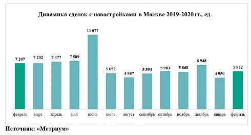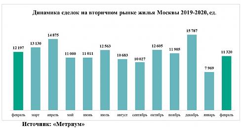 На вторичном рынке жилья в феврале 2020 года ситуация улучшилась. В этот период в Москве заключили 11,3 тыс. договоров купли-продажи жилья, что на 7% меньше, чем в феврале 2019 года. Аналитики «Метриум» отмечают, что это не столь серьезный провал в годовом выражении, какой наблюдался в январе (19%). По сравнению с январем количество договоров купли-продажи вторичного жилья в феврале увеличилось на 42%, что стало самым резким скачком спроса за последние три года.