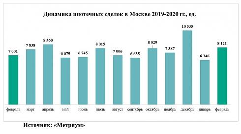 С плюсом завершил февраль рынок ипотечных сделок в Москве. Росреестр зарегистрировал 8,1 тыс. сделок, что на 16% больше, чем в феврале 2019 года (7 тыс. ипотек). По показателю числа сделок в этом месяце прошедший февраль стал рекордным за всю историю наблюдений. К примеру, в феврале 2018 года было заключено 5 тыс. сделок, в феврале 2017 года – 2,8 тыс. сделок.