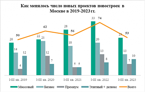 По подсчетам экспертов «Метриум», с января по сентябрь 2023 года московские застройщики начали реализацию 53 проектов, что на 28% меньше, чем в аналогичный период 2022 года. Повысили активность только девелоперы проектов элитного и делюкс-сегмента.
