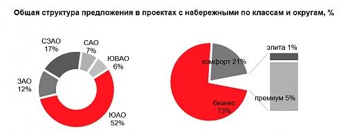 «Половина предложения с набережными из-за определенных особенностей ландшафта столицы реализуется в ЮАО – 52%, меньше приходится на СЗАО – 17% и ЗАО – 12%, - комментирует Владимир Моребис, партнер, коммерческий директор компании Est-a-Tet. – При этом доля бизнес-класса преобладает – 73%, 176 тыс. кв. м, за счет того, что расположение вблизи набережных становится дополнительным преимуществом и повышает класс комплекса».