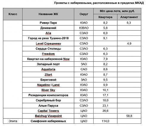 Одним из самых доступных проектов в Москве, в состав которого входит собственная набережная, стал микрорайон «Домашний» от Группы ПСН. Стоимость квартир здесь начинается от 5,8 млн рублей. Апартаменты, относящиеся к комфорт-классу, предлагаются только в одном комплексе – «Ривер Парк», их минимальный бюджет начинается от 5,3 млн рублей. Оставшиеся комплексы реализуются в северо-западном округе – это проект Alia, в котором стартовая цена находится на уровне 6 млн рублей, и ЖК «Город на реке Тушино-2018», в котором цены начинаются от 9,1 млн рублей, так как проект находится на высокой стадии строительной готовности, а часть домов уже готовы. Этой весной в комфорт-классе начнется строительство еще одного масштабного проекта с набережной – ЖК City Bay, который будет возводить известный девелопер MR Group. В комплексе будут предусмотрены собственная набережная, а также спортивная и социальная инфраструктура.