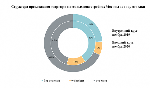 Быстрый рост предложения квартир с отделкой произошёл в последние 12 месяцев. В ноябре 2019 года с отделкой продавались 45% объектов, в формате white box – 14%, а без отделки – 41%.