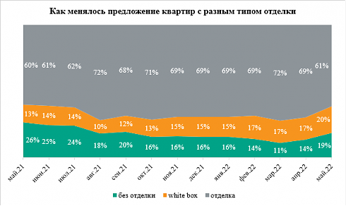В мае 2022 года московские застройщики продавали на рынке новостроек эконом- и комфорт-класса 16,7 тыс. квартир. Из них 3,4 тыс. квартир предлагались с предчистовой отделкой (white box), которая предполагает возведение межкомнатных перегородок, прокладку коммуникаций (электричество, водоснабжение), штукатурку, шпатлевку стен и потолка, устройство черновой стяжки пола.