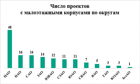 Географическое расположение московских проектов с малоэтажными корпусами неоднородно. В ЦАО находятся 48 комплексов, в НАО и САО – по 16, в ЗАО – 14, в ЮВАО – 12, в СЗАО и ЮАО – по 11, в СВАО – 7, в ВАО – 5, в ТАО и ЮЗАО – по 3, в ЗелАО – 1.