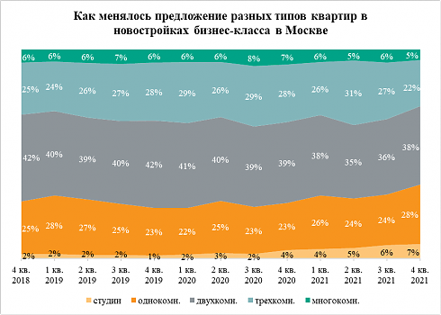 К концу 2021 года количество студий и однокомнатных квартир в сумме превысило 35% от общего объема предложения в новостройках бизнес-класса в Москве, подсчитали аналитики компании «Метриум». Это произошло впервые в истории рынка. Рост доли малоформатных квартир на рынке происходит преимущественно за счет трехкомнатных квартир, чья доля снизилась до 22%.