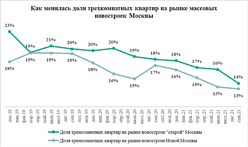 Похожая тенденция наблюдается и в Новой Москве. Здесь в сентябре застройщики продавали 9,8 тыс. квартир. Из них 1,3 тысячи – трехкомнатные. За прошедший квартал их число снизилось на 12%. Таким образом, сейчас на долю трехкомнатных квартир в Новой Москве приходятся 13% предложения жилья. Это всё еще больше, чем у студий (11%), но меньше, чем у однокомнатных квартир (41%) и двухкомнатных (34%). Два года назад трёхкомнатные квартиры составили 19% рынка, студии – 10%, однокомнатные квартиры – 30%, а двухкомнатные – 38%. Как и в «старой» Москве, в Новой Москве маленьких квартир становится больше, чем сравнительно больших.