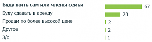 По данным совместного исследования ДОМ.РФ и ВЦИОМ, 67% россиян, желающих приобрести жилье в текущий момент, хотели бы это сделать для собственного пользования. Еще 28% сдавали бы купленное жилье в аренду. Покупка квартиры с целью перепродажи по более высокой цене выступает мотивом только для 2% желающих приобрести жилье.