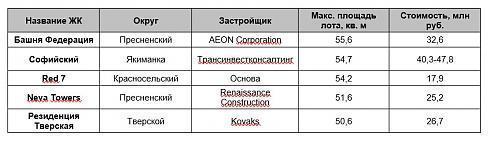 Самая большая студия находится в Башне Федерации, ее площадь составляет 55,6 кв. м, а бюджет – 32,6 млн рублей. В проектах «Софийский» и «Red 7» в продаже представлены студии площадью 54,7 и 54,2 кв. м соответственно, а в комплексах Neva Towers и «Резиденция Тверская» можно найти лоты чуть больше 50 кв. м.