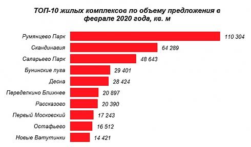 Сейчас же наибольший объем предложения в Новой Москве представлен в ЖК «Румянцево Парк» – на него приходится 23,8 % от всего предложения, вторым по предложению выступает ЖК «Скандинавия» (13,9%), тройку самых масштабных проектном замыкает ЖК «Саларьево Парк» с долей 10,5% от общего объёма предложения первичной недвижимости в Новой Москве.