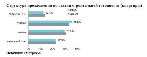 В апреле 2020 года преобладающий объем квартир представлен в домах на стадии отделочных работ (35,8%). По сравнению с предыдущим месяцем их доля увеличилась на 2,4 п.п. Почти треть рынка занимают лоты в корпусах на этапе монтажа этажей (29,5%; -1,0 п.п.). Предложение в новостройках на начальной стадии строительной готовности занимает 22,3% (-0,1 п.п.) рынка. На квартиры в готовых домах приходится наименьшая доля (12,4%; -1,3 п.п.).