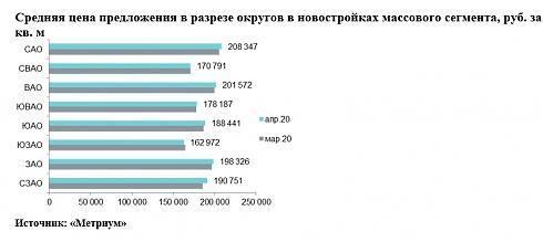 По подсчетам аналитиков «Метриум», в апреле 2020 года на рынке новостроек массового сегмента средняя цена предложения увеличилась на 0,9% и составила 187 560 руб. за кв. м. Рост цен в пределах 0,1-2,9% отмечен во всех округах, за исключением ЮЗАО, где средняя цена сократилась на 1,1%. На снижение цены в округе повлияло изменение структуры экспозиции (уменьшение объема реализации недорогого предложения).