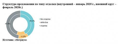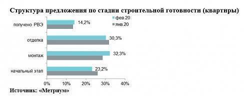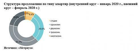 По данным «Метриум», в феврале 2020 года на первичном рынке жилья массового сегмента продажи велись в 91 комплексе, в которых экспонировалось около 14 8101 квартир (площадью 0,86 млн кв. м). За месяц объём предложения снизился на 7%.