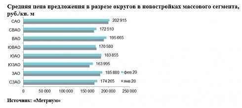 По подсчетам аналитиков «Метриум», средняя цена предложения на рынке массового сегмента в феврале 2020 года выросла на 1,7% и составила 181 555 руб. за кв. м. Положительная динамика зафиксирована в большинстве округов (от 0,5% до 5,2%), кроме ЮВАО, где показатель снизился на 1,1%. На снижение средней цены в округе повлияло поступление в реализацию нового объёма недорогого предложения (прежде всего, новой очереди в «Квартале Некрасовка») и изменение структуры экспозиции.