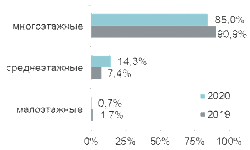 За год доля квартир в многоэтажных домах (от 10 этажей) снизилась на 5,9 п.п. до 85%, а в среднеэтажных (от 3 до 9 этажей) выросла на 6,9 п.п. до 14,3% рынка. Положительная динамика количества квартир, расположенных в среднеэтажных домах, преимущественно связана с выходом в реализацию нового проекта homecity и возвращением в продажу ЖК «Эдельвейс» со значительным объемом предложения. Доля квартир в малоэтажных домах (до 3 этажей) снизилась на 1 п.п. и составила всего 0,7%.