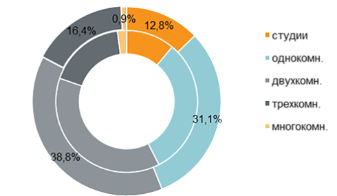 Структура предложения по типу квартир (внутренний круг – 2019 г., внешний круг – 2020 г.)