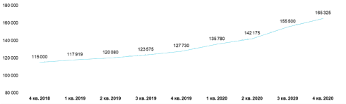 На протяжении нескольких последних лет на рынке новостроек ТиНАО отслеживается положительная динамика средних цен. К концу 2020 года средневзвешенный показатель достиг 165 тыс. руб. за кв. м. Рост за год составил 29,4% (за квартал – 6,3%). Вырос и бюджет предложения, в декабре средняя стоимость квартиры составила 8,76 млн руб. относительно предыдущего квартала показатель вырос на 5,2%, относительно 2019 года – на 25,6%.