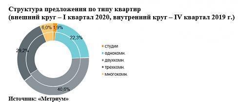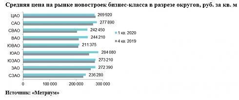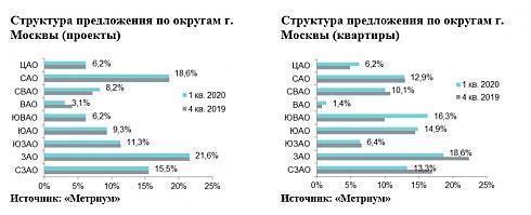 По данным «Метриум», по итогам I квартала 2020 года на рынке новостроек бизнес-класса Москвы в реализации находилось 12 450 квартир (952,2 тыс. кв. м) в 97 проектах, что на 11,9% меньше, чем в конце 2019 года. За три месяца был объявлен официальный старт продаж только в анонсированном ранее ЖК «Павелецкая Сити». Других новых проектов замечено не было, однако, возобновилась приостановленная ранее реализация двух комплексов. Также рынок пополнился несколькими корпусами в уже реализуемых новостройках: