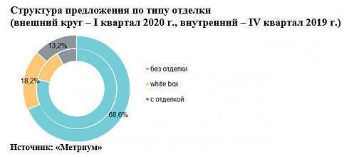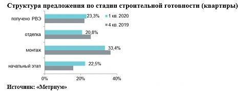 Несмотря на общее снижение предложения на рынке, в I квартале 2020 года зафиксирован рост доли квартир в корпусах на начальной стадии строительной готовности (22,5%, +6,7 п.п.). Сопоставимый объем экспозиции сосредоточен в новостройках на этапе отделочных работ (20,8%, -4,7 п.п.) и в готовых домах (23,3%, +1,2 п.п.). Треть рынка представлена в объектах на стадии монтажа этажей (33,4%, -3,2 п.п.).