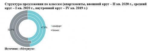 На рынке апартаментов реализуется практически равный объем предложения комфорт- и бизнес-класса – 47,9% и 52,1% соответственно. При этом доля последнего за отчетный период увеличилась на 1,4 п.п.