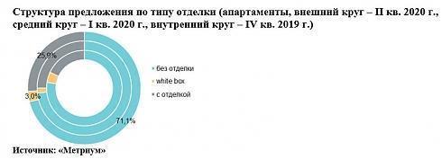За отчетный период существенно увеличилась доля апартаментов с чистовой отделкой (+7,8 п.п.), к концу I полугодия 2020 года она составила 25,9% всех лотов. Однако предложение без отделки по-прежнему занимает преобладающую долю на рынке апартаментов – 71,1% (-6,3 п.п.). Наименьший объем экспонируемых лотов реализуется с отделкой white box (3%, -1,5 п.п.).