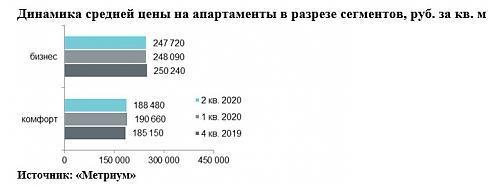 За последние полгода уровень цен на апартаменты не претерпел значительных корректировок. На рынке массового сегмента средний показатель вырос на 1,8% и составил 188 480 руб. за кв. м, в бизнес-классе отмечено снижение ценового уровня на 1% до 247 720 руб. за кв. м. Примечательно, что на рынке квартир соответствующих сегментов цены изменились в большей степени – на 4% в комфорт-классе и на 7,3% в сегменте бизнес».
