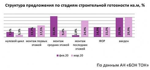 Почти половина предложения по итогам марта находится на заключительных стадиях готовности: 15% относится к новостройкам на этапе ФОР (фасадно-отделочных работ), 29,9% представлено введенными объемами, а 24,9% находится в процессе монтажа последних этажей. Заметим, что по итогам марта такие новостройки показали значительный прирост – доля подскочила с 2,8% до 24,9%, а объем вырос в 9 раз!