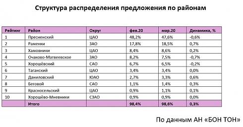 ТОП-10 локаций представлен такими районами, как Пресненский, Раменки, Хамовники, Очаково-Матвеевское, Хорошевский, Таганский, Даниловский, Беговой, Красносельский, Хорошево-Мневники. В общей сложности на данные территории приходится 98,6% рынка квартир премиум-класса. Однако в явных лидерах Пресненский, «забирающий» 47,6% предложения. Также выделяется район Раменки с 18,5%.