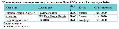 Отдельно стоит отметить активность девелоперов в Новой Москве – в I полугодии 2020 года на рынок поступил значительный объем нового предложения. Для сравнения – в I полугодии 2019 года был выведен всего один новый проект против трех новых жилых комплексов в текущем году, хотя некоторые из них давно разрабатывались и ожидались к выходу на рынок. Некоторые из новых проектов отличаются высокими качественными характеристиками бизнес-класса, которые, как правило, не часто встречаются в объектах Новой Москвы».