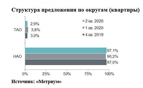 Все поступившие объекты реализуются в Новомосковском административном округе (НАО). Именно здесь по-прежнему сосредоточен превалирующий объем предложения – 97,1%. Доля Троицкого округа (ТАО) составила 2,9%.