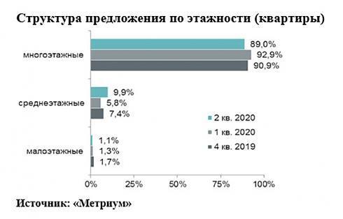 По данным «Метриум», в конце I полугодия 2020 года на первичном рынке жилой недвижимости Новой Москвы в реализации находилось 33 новостройки с совокупным объемом предложения около 9 220 лотов (493,9 тыс. кв. м). С начала года суммарное предложение сократилось на 1,1% по количеству реализуемых лотов и на 5% по общей продаваемой площади. Вместе с тем за отчетный период в продажу поступило три новых жилых комплекса и 14 корпусов в уже реализуемых проектах.