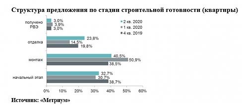 Наибольший объем предложения в Новой Москве сосредоточен в новостройках на стадии возведения этажей – 40,5%. Стоит отметить, что эта цифра за квартал существенно сократилась (-10,4 п.п.) в связи с переходом ряда объектов на новый этап строительства. Так, увеличилась доля жилья на этапе отделочных работ – 23,8% (+9,3 п.п. по сравнению с 1 кварталом 2020 года). Также внушительную долю рынка занимают квартиры в проектах с нулевым циклом строительства – 32,7%, высокий показатель поддерживается благодаря регулярному поступлению в реализацию новых корпусов в крупнейших проектах Новой Москвы, а также выводу новых жилых комплексов. Процент лотов в домах, уже получивших РВЭ, минимален – 3%, за последние полгода доля готового жилья не изменилась.