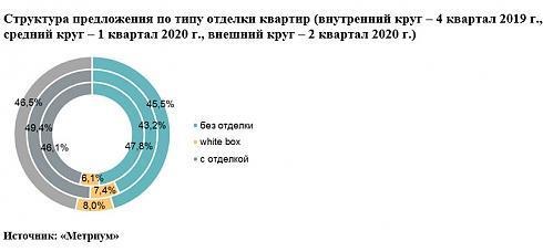 В Новой Москве лоты без отделки и квартиры с готовым ремонтом занимают практически равный объем предложения – 45,5% (+2,3 п.п.) и 46,5% (-2,9 п.п.) соответственно. Квартиры с отделкой white box составляют 8% всего предложения, причем их доля растет (+0,6 п.п. по сравнению с 1 кварталом 2020 года и +1,9 п.п. по сравнению с концом 2019 года).