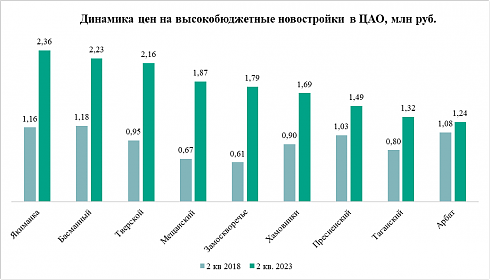 Заметно выросли средние цены в Якиманке (в два раза до 2,36 млн рублей за кв. м), в Хамовниках и в Басманном районе (на 89% соответственно до 1,69 млн и 2,23 млн рублей за кв.м). В Таганском районе квадратный метр в среднем подорожал за пять лет на 64% (до 1,32 млн рублей), а в Пресненском – на 44% (до 1,49 млн рублей). Самую скромную динамику продемонстрировал Арбат (15%) до 1,24 млн рублей за кв. м.