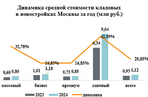 Кладовые с минимальной и максимальной стоимостью на первичном рынке Москвы по итогам 2024 года (по сегментам)