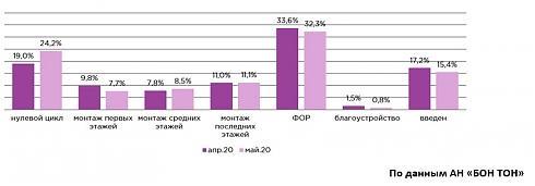 Аналитики АН «БОН ТОН» подвели итоги мая на первичном рынке квартир комфорт-класса и изучили распределение предложения по стадиям строительной готовности. На стадии фасадно-отделочных работ (ФОР) реализуется 32,3% от общего количества квадратных метров. На этапе благоустройства находится 0,8% предложения. Еще 15,4% представлено вводимыми объемами. Несмотря на то, что за месяц доля предложения на заключительных стадиях готовности (ФОР, благоустройство, ввод) снизилась на 3,8%, разница на рынке все еще сохраняется. Для сравнения, на начальной стадии находится 31,9% новостроек, в том числе 24,2% на этапе нулевого цикла.