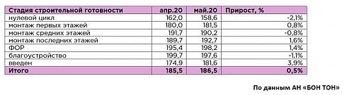 Одновременно аналитики АН «БОН ТОН» наблюдают разнонаправленный вектор движения цен в зависимости от стадии строительной готовности. По итогам мая отмечается понижение СВЦ на старте, что обусловлено выходом в реализацию новых объемов жилья. Также незначительную отрицательную динамику показали новостройки на стадии монтажа средних этажей и благоустройства.