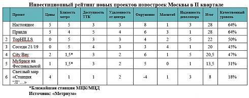 На этот раз первую позицию с равным количеством очков заняли сразу два «новичка» – жилой комплекс бизнес-класса «Настоящее» (Раменки) и комплекс апартаментов «Правда» (Беговой район). Оба проекта набрали по 28 баллов (64% от максимально возможного), тогда как лидер инвестиционного рейтинга I квартала (Monodom Family) набрал 25 баллов (57%).