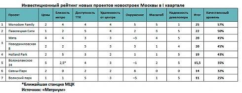 В I квартале на рынок новостроек Москвы в продаже появились восемь проектов комфорт- и бизнес-класса. В целом анализ этих объектов показал, что половину из них можно отнести к «середнякам» с точки зрения инвестиционной привлекательности.